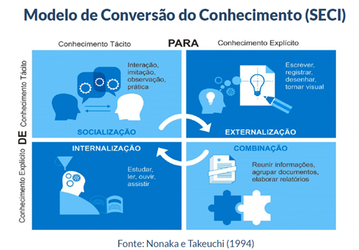 De acordo com eles, o conhecimento é criado a partir da interação entre o conhecimento tácito (aquele que está na mente das pessoas) e o conhecimento explícito (aquele que pode ser expresso de forma clara e objetiva). Essa interação acontece de quatro formas diferentes: a socialização, que é a conversão do conhecimento tácito em conhecimento tácito; a externalização, que é a conversão do conhecimento tácito em conhecimento explícito; a combinação, que é a conversão do conhecimento explícito em conhecimento explícito; e a internalização, que é a conversão do conhecimento explícito em conhecimento tácito.