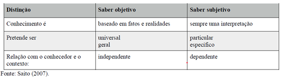 Quadro 2.3 – Distinção entre saber objetivo e saber subjetivo