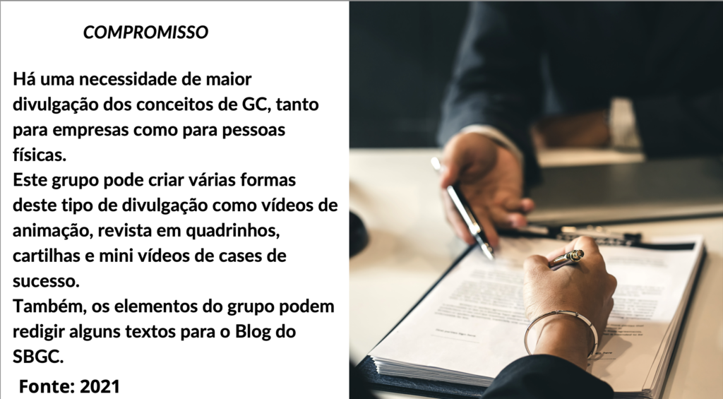 Há uma necessidade de maior divulgação dos conceitos de GC, tanto para empresas como para pessoas físicas. Este grupo pode criar várias formas deste tipo de divulgação como vídeos de animação, revista em quadrinhos, cartilhas e mini vídeos de cases de sucesso.